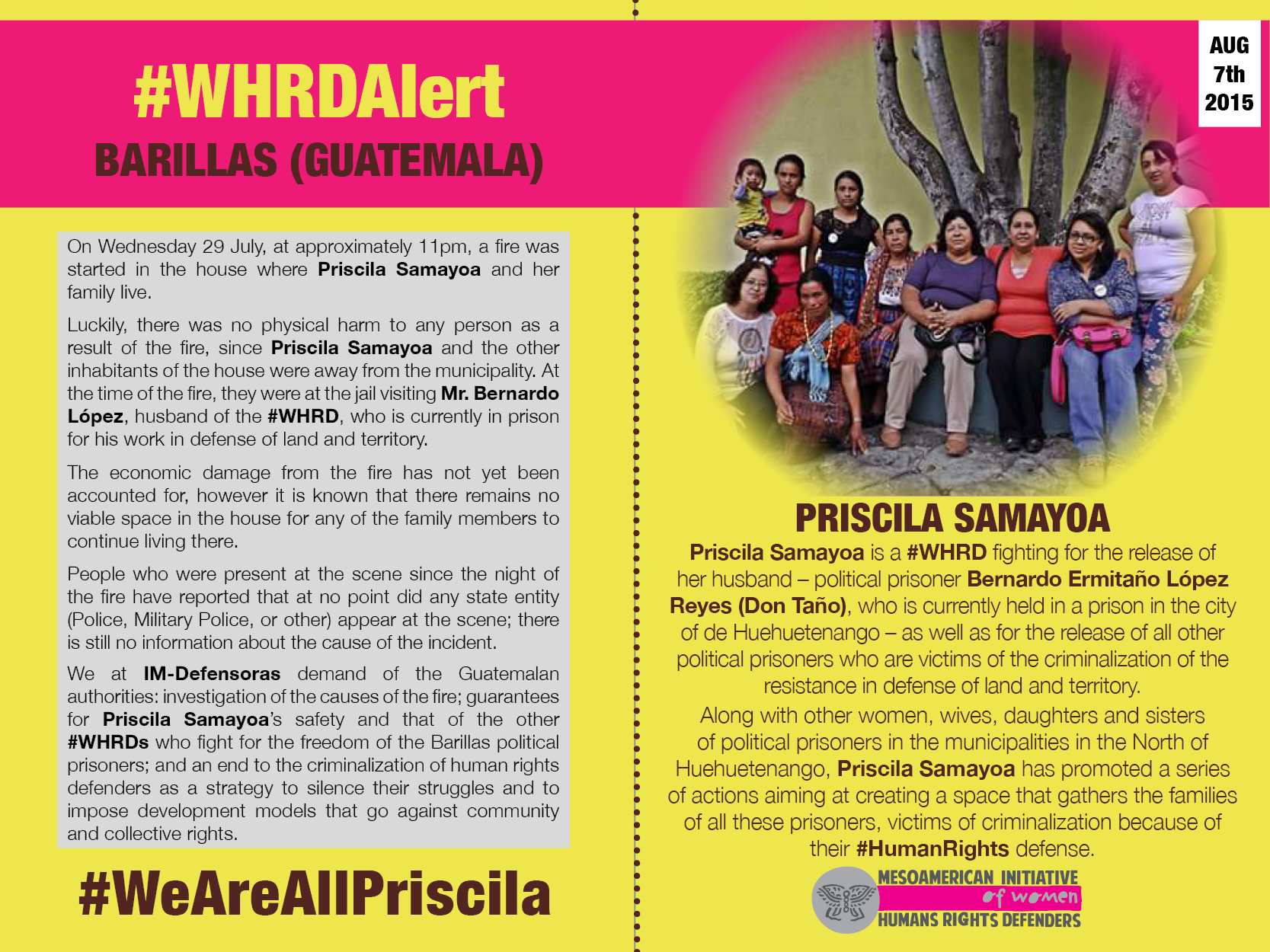We at IM-Defensoras demand of the Guatemalan authorities: investigation of the causes of the fire; guarantees for Priscila Samayoa’s safety and that of the other WHRDs who fight for the freedom of the Barillas political prisoners; and an end to the criminalization of human rights defenders as a strategy to silence their struggles and to impose development models that go against community and collective rights.