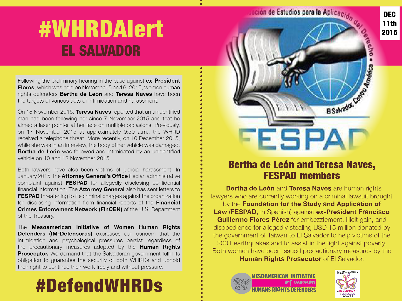 The Mesoamerican Initiative of Women Human Rights Defenders (IM-Defensoras) expresses our concern that the intimidation and psychological pressures persist regardless of the precautionary measures adopted by the Human Rights Prosecutor. We demand that the Salvadoran government fulfill its obligation to guarantee the security of both WHRDs and uphold their right to continue their work freely and without pressure.