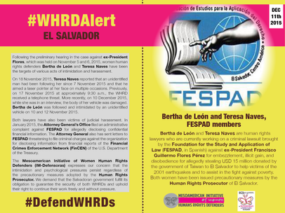 Following the preliminary hearing in the case against ex-President Flores, which was held on November 5 and 6, 2015, women human rights defenders Bertha de León and Teresa Naves have been the targets of various acts of intimidation and harassment.