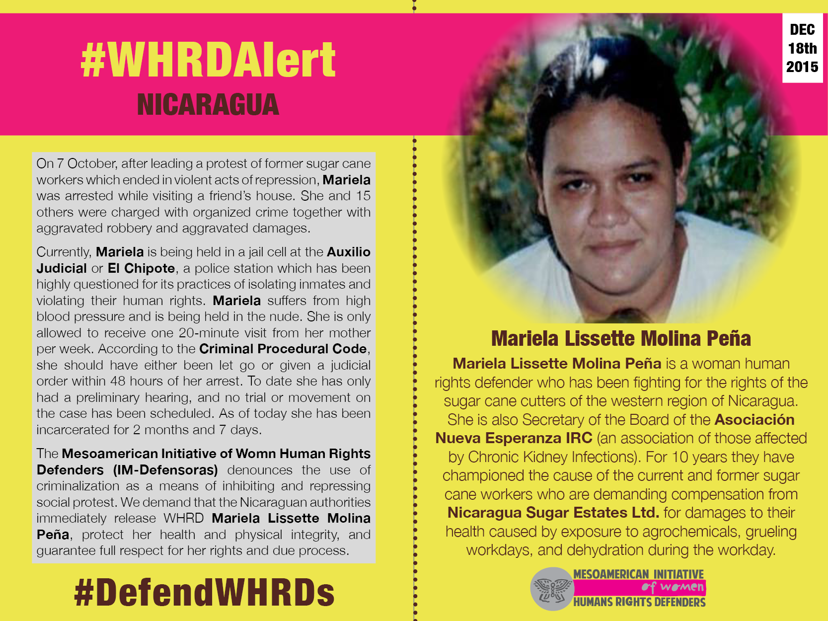 The Mesoamerican Initiative of Womn Human Rights Defenders (IM-Defensoras) denounces the use of criminalization as a means of inhibiting and repressing social protest. We demand that the Nicaraguan authorities immediately release WHRD Mariela Lissette Molina Peña, protect her health and physical integrity, and guarantee full respect for her rights and due process.