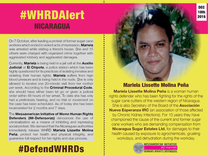Mariela Lissette Molina Peña is a woman human rights defender who has been fighting for the rights of the sugar cane cutters of the western region of Nicaragua. She is also Secretary of the Board of the Asociación Nueva Esperanza IRC (an association of those affected by Chronic Kidney Infections). For 10 years they have championed the cause of the current and former sugar cane workers who are demanding compensation from Nicaragua Sugar Estates Ltd. for damages to their health caused by exposure to agrochemicals, grueling workdays, and dehydration during the workday.
