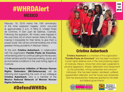 The Mesoamerican Initiative of Women Human Rights Defenders (IM-Defensoras) will be following and supporting the work of our colleague Cristina Auberbach, who is a member of the Mexico National Network of Women Human Rights Defenders.