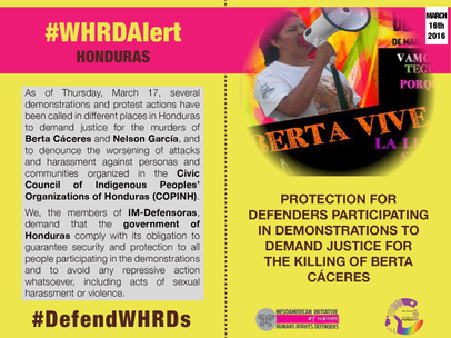 We, the members of IM-Defensoras, demand that the government of Honduras comply with its obligation to guarantee security and protection to all people participating in the demonstrations and to avoid any repressive action whatsoever, including acts of sexual harassment or violence.