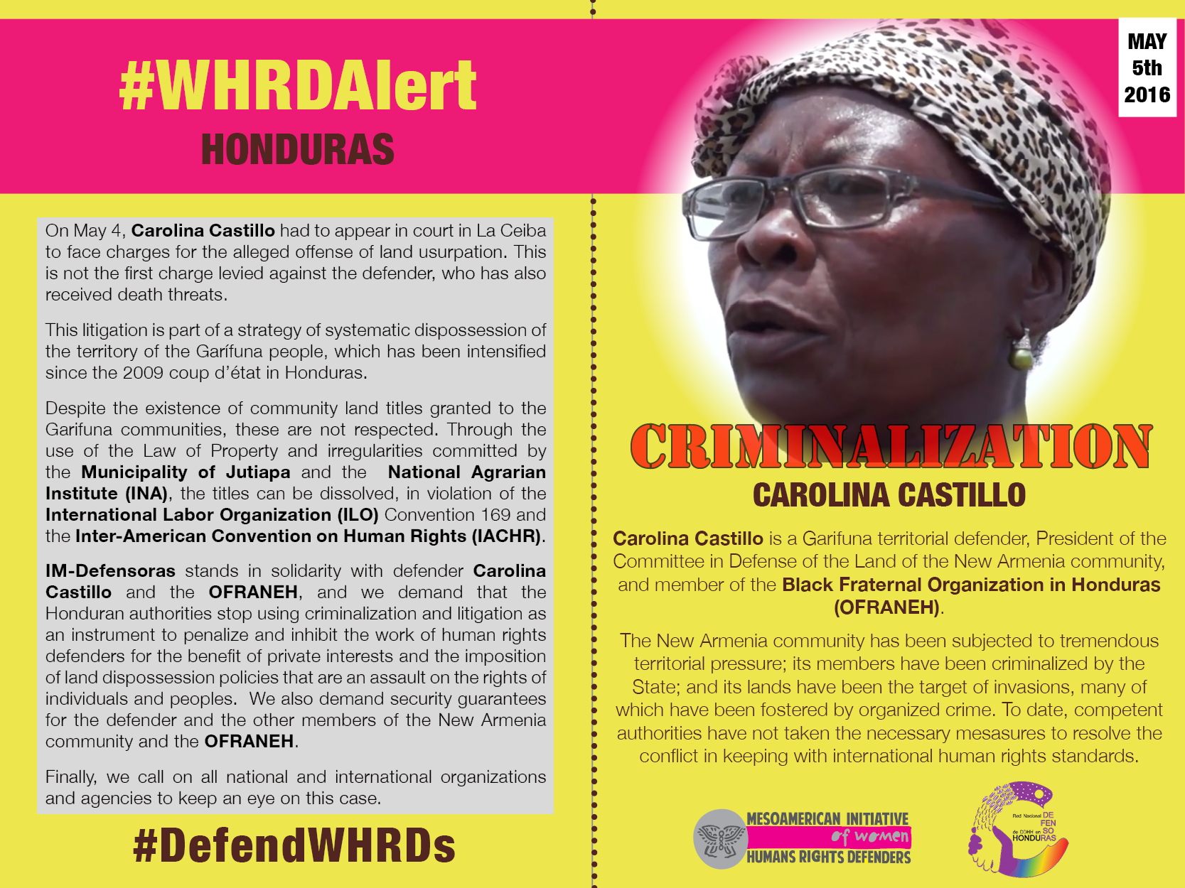 On May 4, Carolina Castillo had to appear in court in La Ceiba to face charges for the alleged offense of land usurpation. This is not the first charge levied against the defender, who has also received death threats.