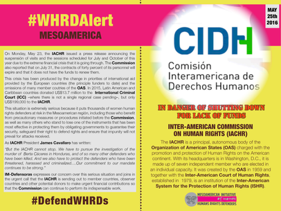 IM-Defensoras expresses our concern over this serious situation and joins in the urgent call that the IACHR is sending out to member countries, observer countries and other potential donors to make urgent financial contributions so that the Commission can continue to perform its indispensable work.
