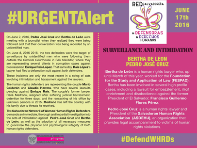 On June 8, 2016 2016, the two defenders were the target pf surveillance by unidentified men who were following them outside the Criminal Courthouse in San Salvador, where they are representing several clients in corruption cases against businessman Enrique Rais López. That same day Rais López's lawyer had filed a defamation suit against both defenders.