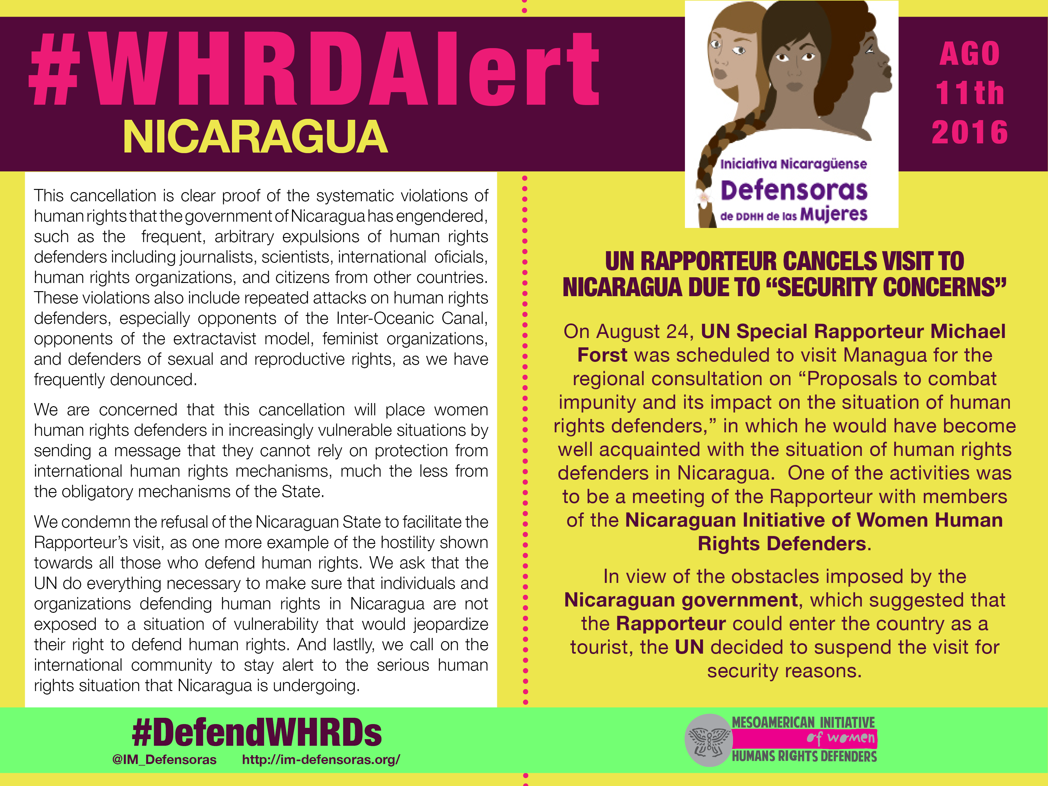 Mesoamerica, August 11, 2016 - The 750 women human rights defenders of El Salvador, Guatemala, Honduras, México and Nicaragua who make up the Mesoamerican Initiative of Women Human Rights Defenders (IM-Defensoras) lament the recent cancellation of the visit to Nicaragua from the Special UN Rapporteur on the Situation of Women Human Rights Defenders, Mr. Michel Forst.