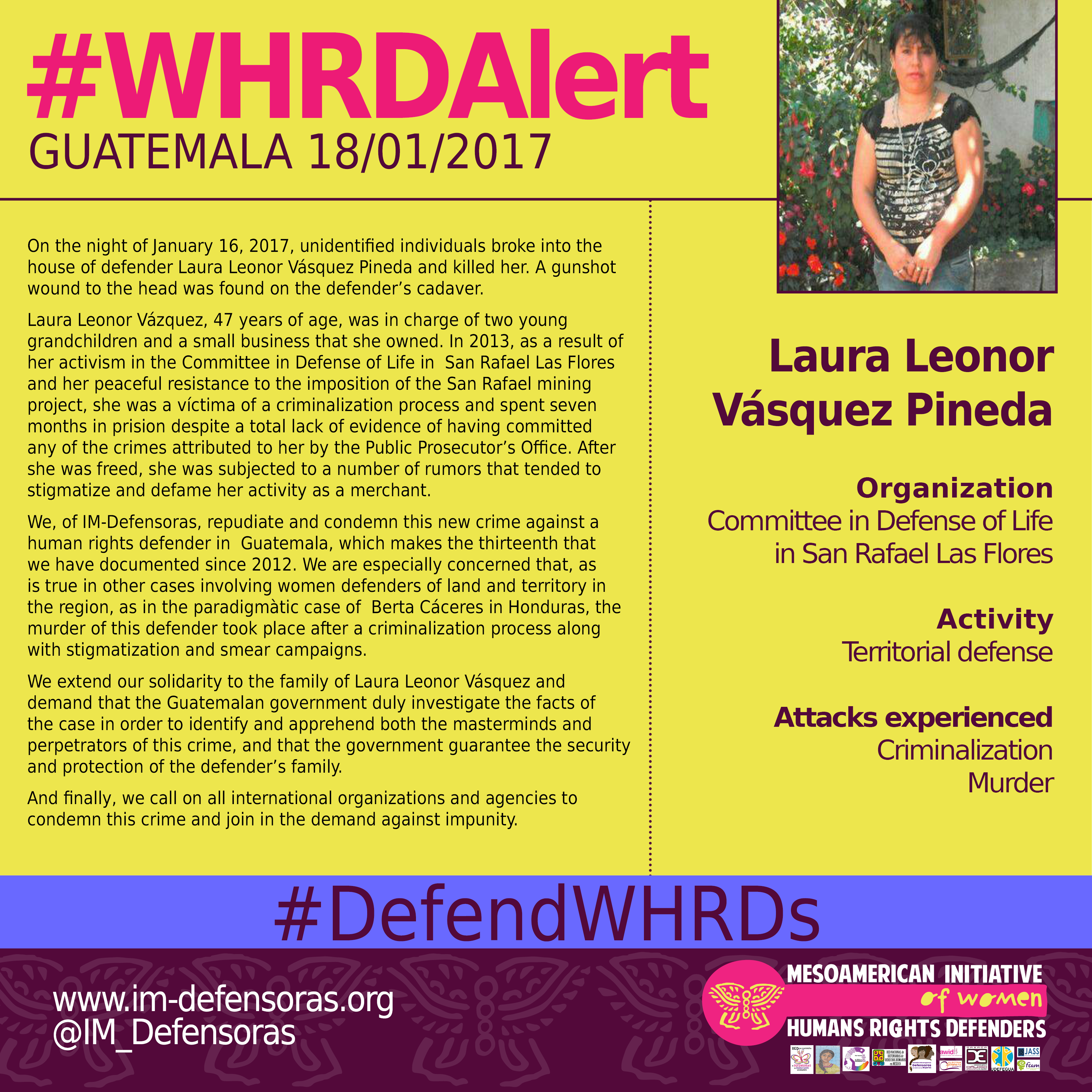 We, of IM-Defensoras, repudiate and condemn this new crime against a human rights defender in Guatemala, which makes the thirteenth that we have documented since 2012. We are especially concerned that, as is true in other cases involving women defenders of land and territory in the region, as in the paradigmàtic case of Berta Cáceres in Honduras, the murder of this defender took place after a criminalization process along with stigmatization and smear campaigns.