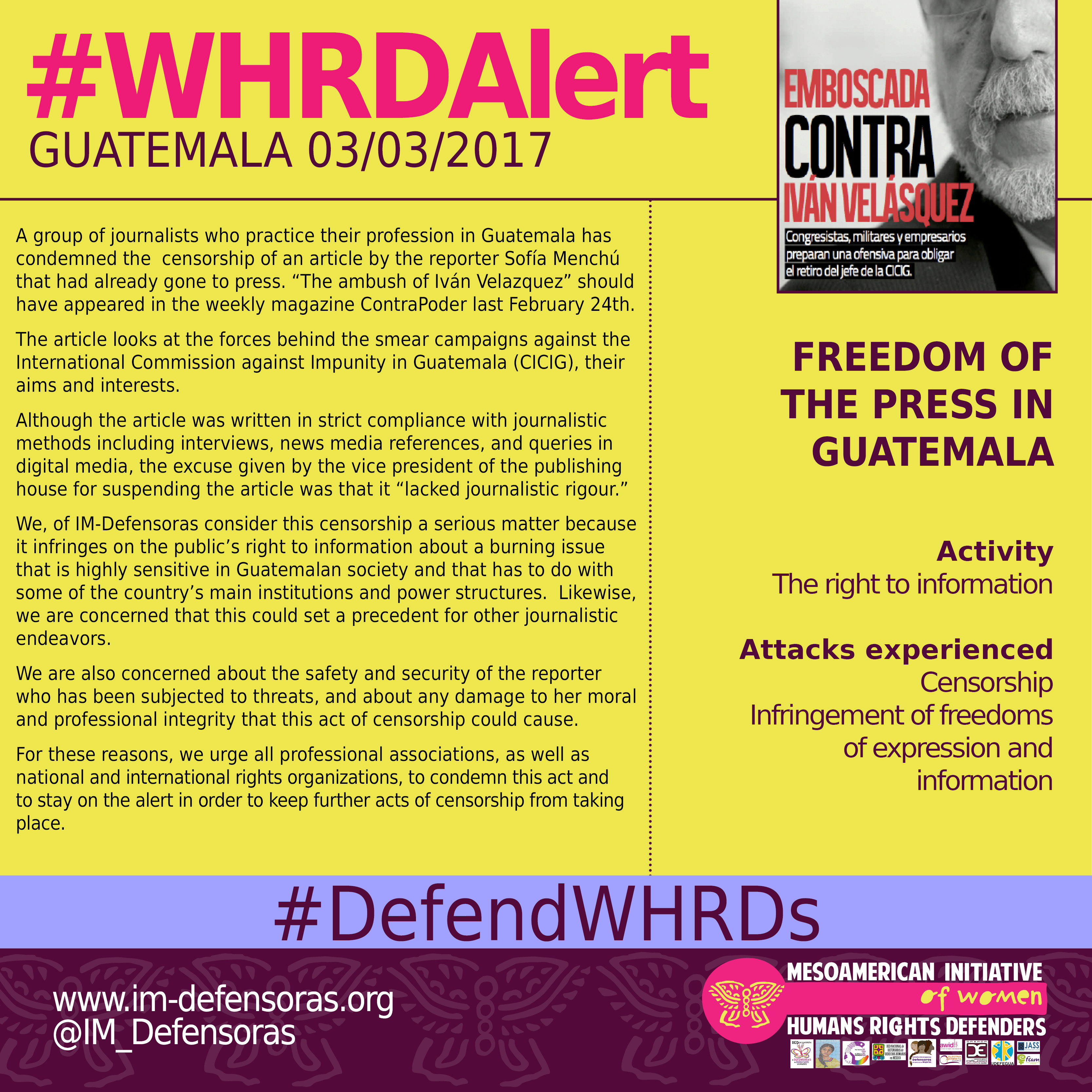 We, of IM-Defensoras consider this censorship a serious matter because it infringes on the public’s right to information about a burning issue that is highly sensitive in Guatemalan society and that has to do with some of the country’s main institutions and power structures. Likewise, we are concerned that this could set a precedent for other journalistic endeavors.