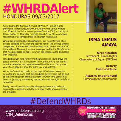 We, of IM-Defensora condemn this unjustified detention of the defender and demand that the Honduran government put an end to the criminalization and harassment to which Irma Lemus has been subjected, guaranteeing her security and her right to defend defenders.