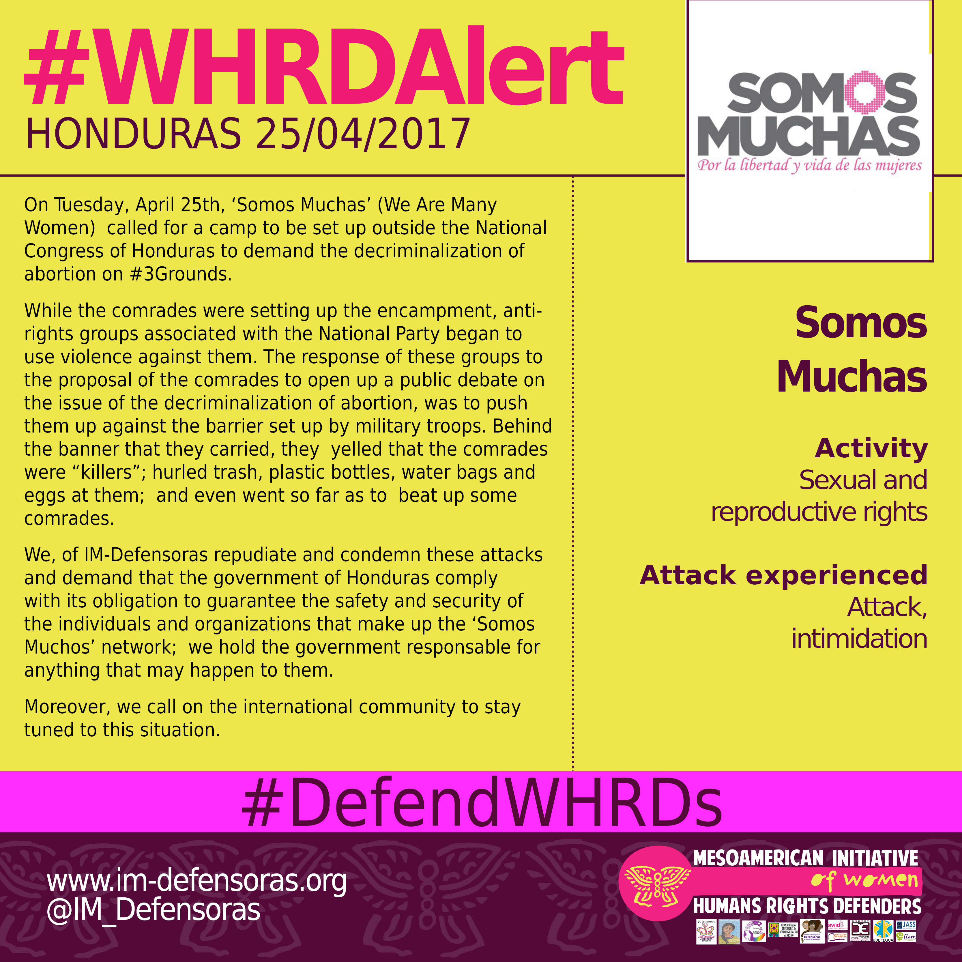 We, of IM-Defensoras repudiate and condemn these attacks and demand that the government of Honduras comply with its obligation to guarantee the safety and security of the individuals and organizations that make up the ‘Somos Muchos’ network; we hold the government responsable for anything that may happen to them.