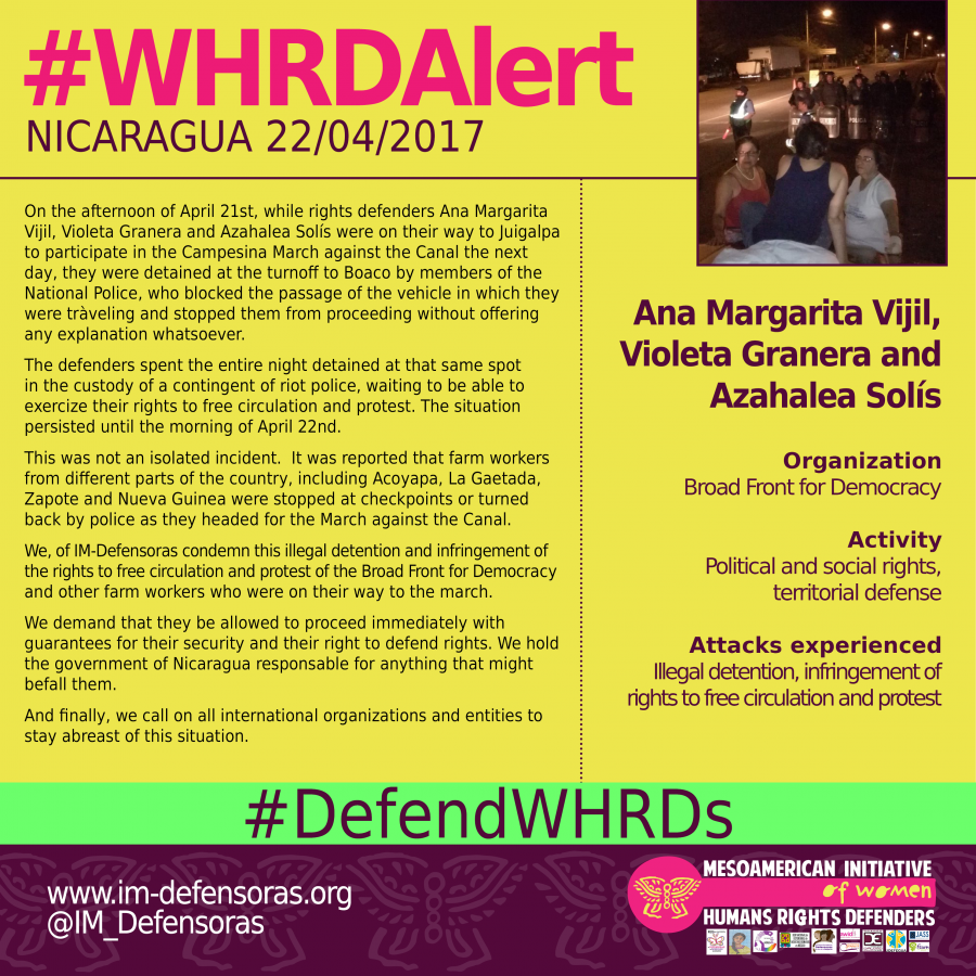 THE FACTS – On the afternoon of April 21st, while rights defenders Ana Margarita Vijil, Violeta Granera and Azahalea Solís were on their way to Juigalpa to participate in the Campesina March against the Canal the next day, they were detained at the turnoff to Boaco by members of the National Police, who blocked the passage of the vehicle in which they were tràveling and stopped them from proceeding without offering any explanation whatsoever.