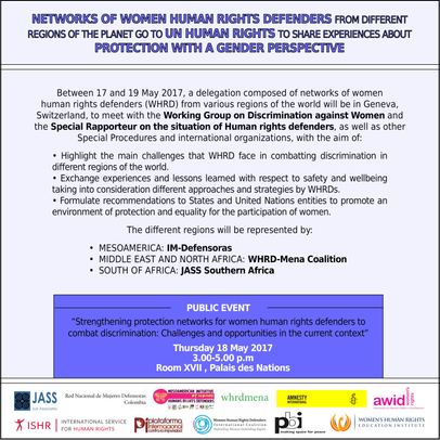 Between 17 and 19 May 2017, a delegation composed of networks of women human rights defenders (WHRD) from various regions of the world will be in Geneva, Switzerland, to meet with the Working Group on Discrimination against Women and the Special Rapporteur on the situation of Human rights defenders, as well as other Special Procedures and international organizations, with the aim of: