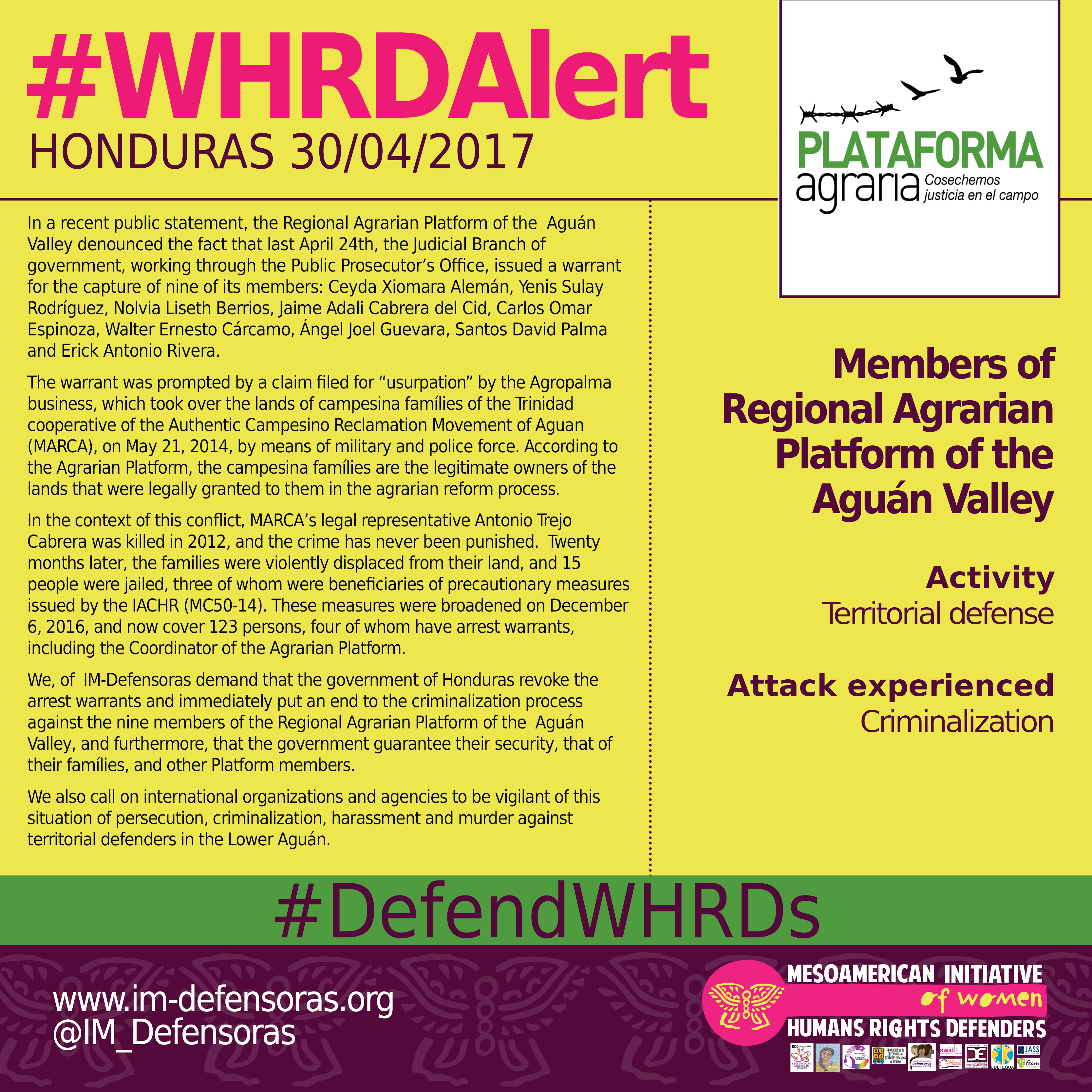 We, of IM-Defensoras demand that the government of Honduras revoke the arrest warrants and immediately put an end to the criminalization process against the nine members of the Regional Agrarian Platform of the Aguán Valley, and furthermore, that the government guarantee their security, that of their famílies, and other Platform members.