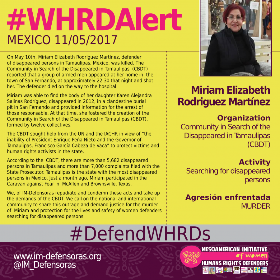 THE FACTS – On May 10th, Miriam Elizabeth Rodríguez Martínez, defender of disappeared persons in Tamaulipas, México, was killed. The Community in Search of the Disappeared in Tamaulipas (CBDT) reported that a group of armed men appeared at her home in the town of San Fernando, at approximately 22:30 that night and shot her. The defender died on the way to the hospital.