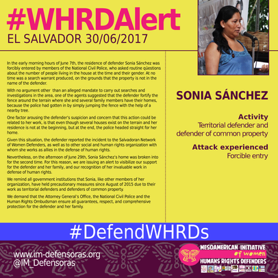 THE FACTS – In the early morning hours of June 7th, the residence of defender Sonia Sánchez was forcibly entered by members of the National Civil Police, who asked routine qüestions about the number of people líving in the house at the time and their gender. At no time was a search warrant produced, on the grounds that the property is not in the name of the defender.