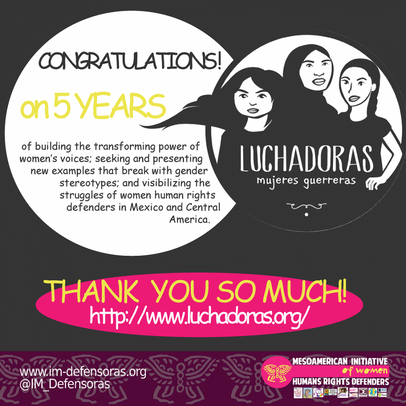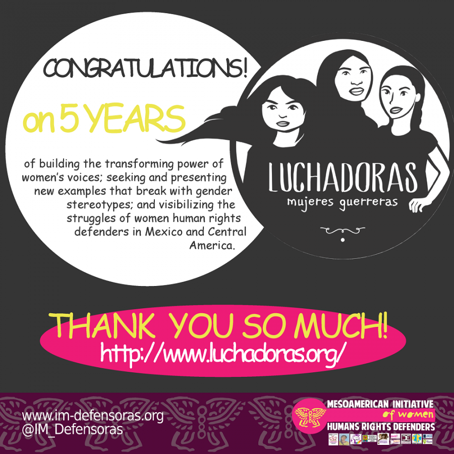 Congratulations to Luchadoras TV on 5 years of building the transforming power of women’s voices; seeking and presenting new examples that break with gender stereotypes; and visibilizing the struggles of women human rights defenders in Mexico and Central America.