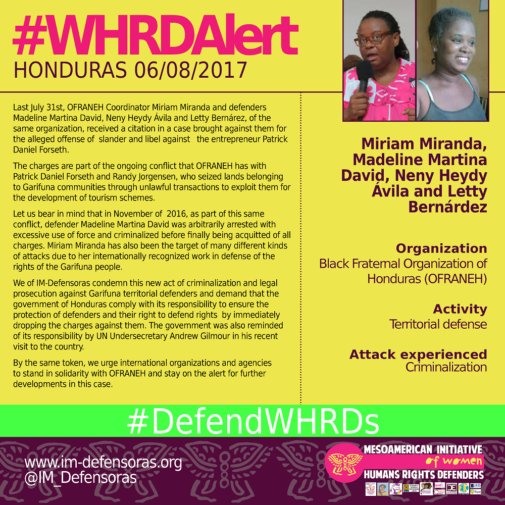 THE FACTS – Last July 31st, OFRANEH Coordinator Miriam Miranda and defenders Madeline Martina David, Neny Heydy Ávila and Letty Bernárez, of the same organization, received a citation in a case brought against them for the alleged offense of slander and libel against the entrepreneur Patrick Daniel Forseth.