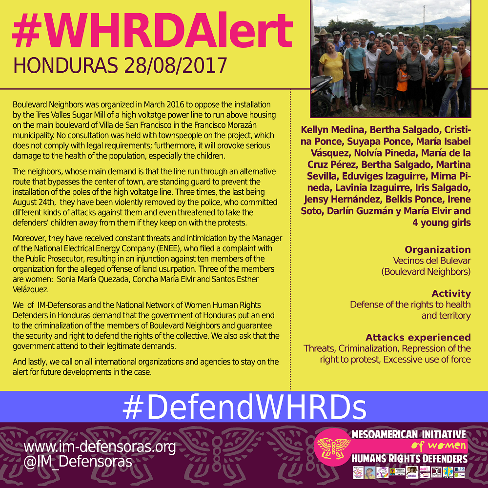 We of IM-Defensoras and the National Network of Women Human Rights Defenders in Honduras demand that the government of Honduras put an end to the criminalization of the members of Boulevard Neighbors and guarantee the security and right to defend the rights of the collective. We also ask that the government attend to their legitimate demands.