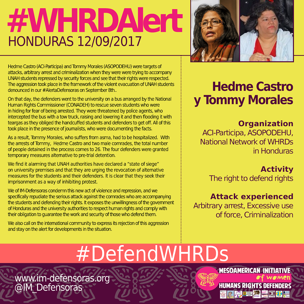 THE FACTS – Hedme Castro (ACI-Participa) and Tommy Morales (ASOPODEHU) were targets of attacks, arbitrary arrest and criminalization when they were were trying to accompany UNAH students repressed by security forces and see that their rights were respected. The aggression took place in the framework of the violent evacuation of UNAH students denounced in our #AlertaDefensoras el 8 de septiembre.