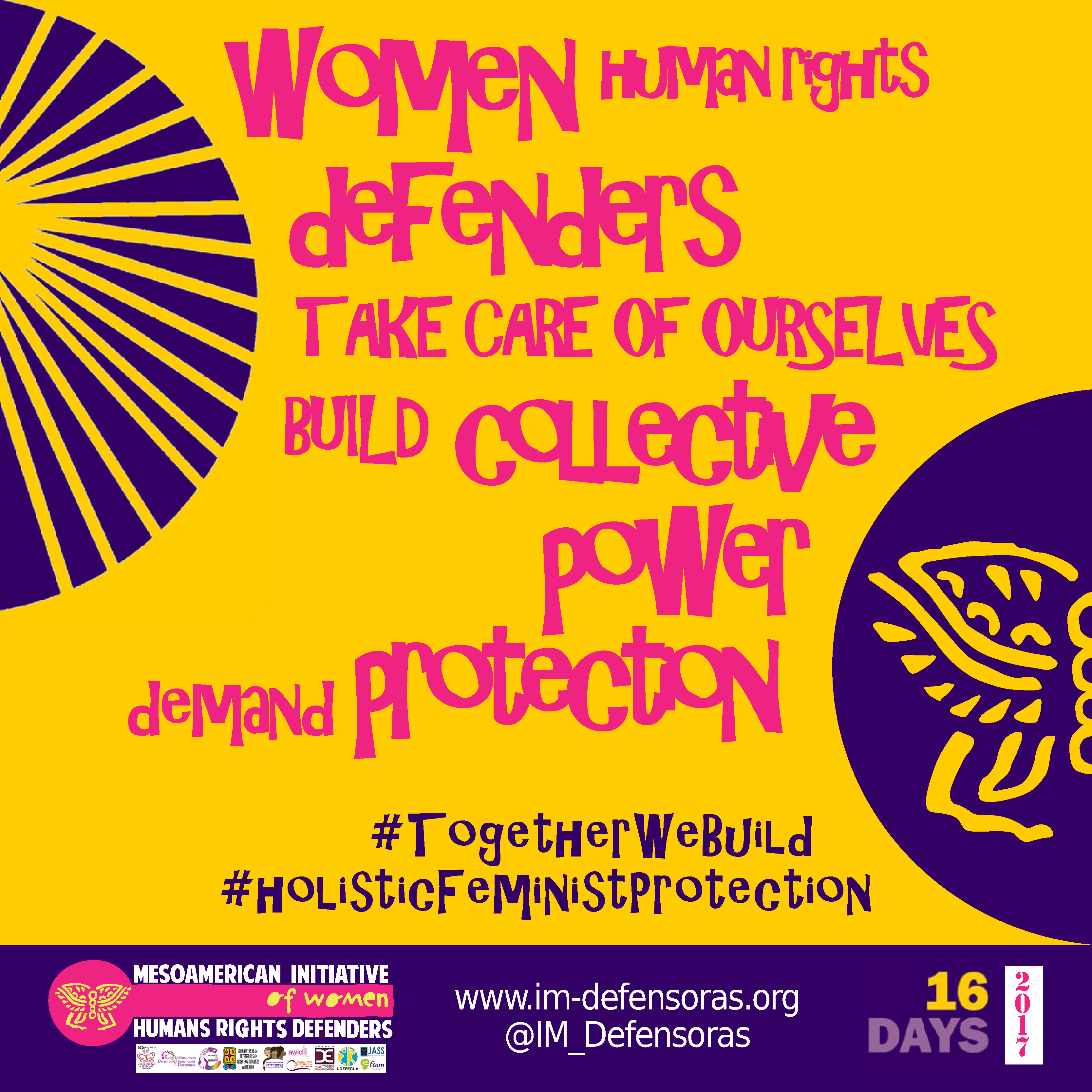 This year, we of IM-Defensoras in consensus with our five national groupings, under the slogan “Women human rights defenders take care of ourselves; we build collective power; we demand protection”, have decided to orient this year’s Campaign towards lending visibility to the situation of risk and aggression experienced by women defenders, using advanced material taken from our Mesoamerican Registry of Attacks against Women Defenders during the 2012-2016 period. We will also remind governments of their obligations regarding our protection and insist on compliance with our demands. And we will foster the increasingly evident and desperate need to adopt Holistic Feminist Protection strategies that offer an optimal response in keeping with the context and specific characteristics of our struggles and movements.