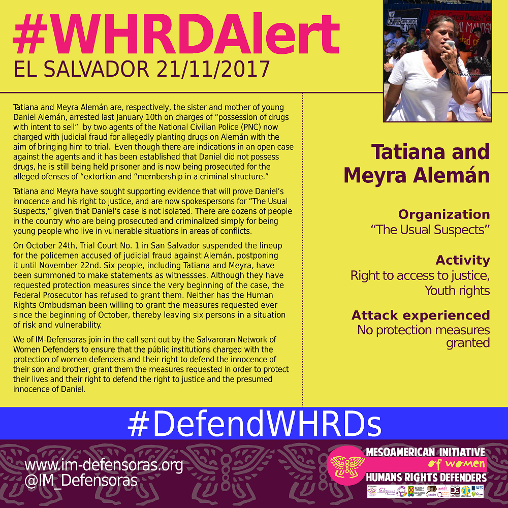 We of IM-Defensoras join in the call sent out by the Salvaroran Network of Women Defenders to ensure that the públic institutions charged with the protection of women defenders and their right to defend the innocence of their son and brother, grant them the measures requested in order to protect their lives and their right to defend the right to justice and the presumed innocence of Daniel.
