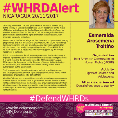 THE FACTS – On Friday, November 17th, the government of Nicaracua blocked entry to the country of Esmeralda Arosemena, IACHR Rapporteur for the Rights of Children and Adolescents. She had been invited to attend a forum on Monday, November 20th, on the role of civil society organizations in the promotion and defense of the rights of children and adolescents, with emphasis on special protection.