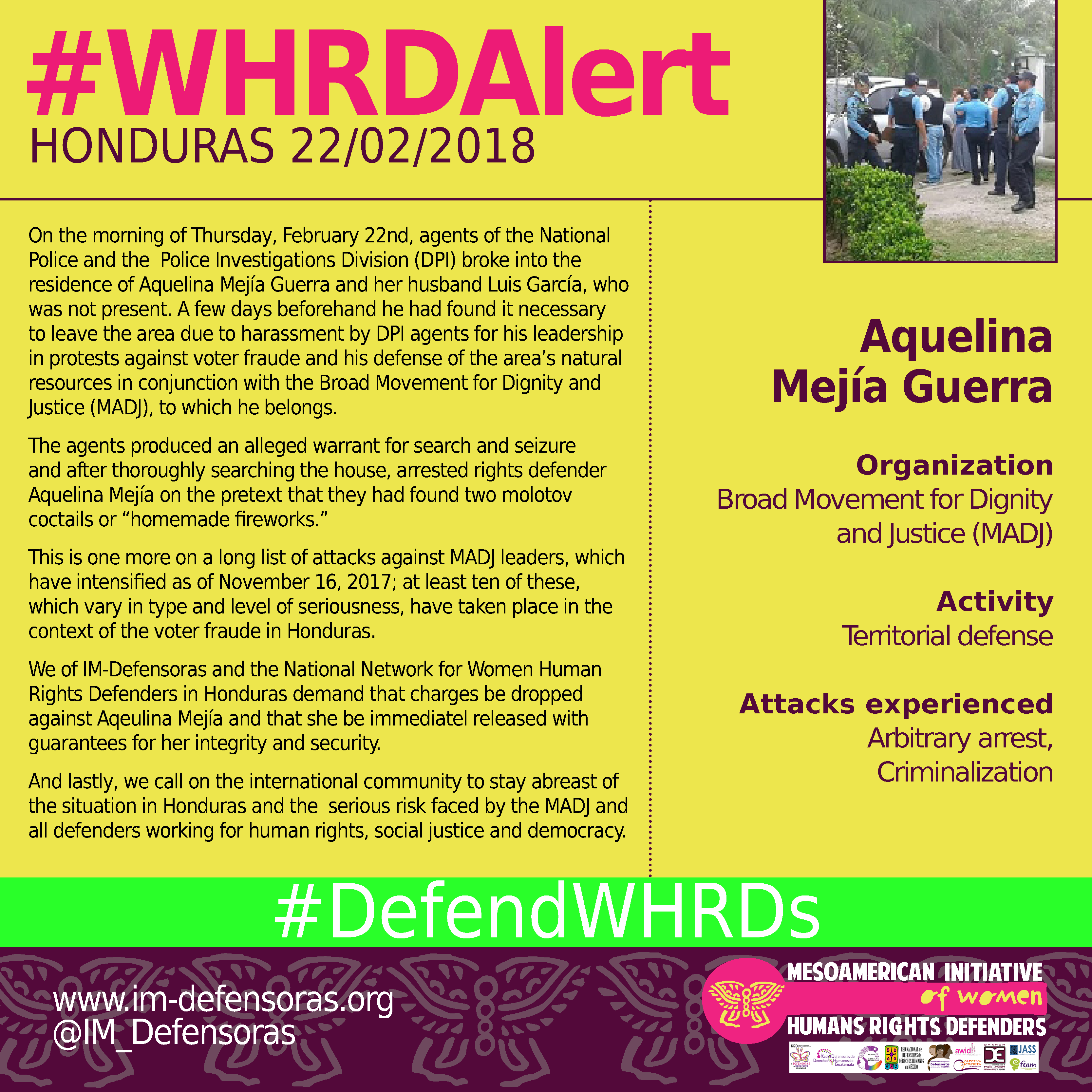 We of IM-Defensoras and the National Network for Women Human Rights Defenders in Honduras demand that charges be dropped against Aqeulina Mejía and that she be immediatel released with guarantees for her integrity and security.