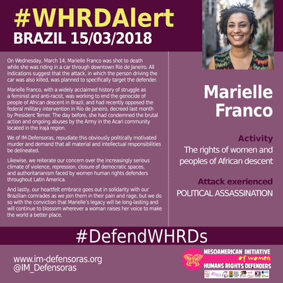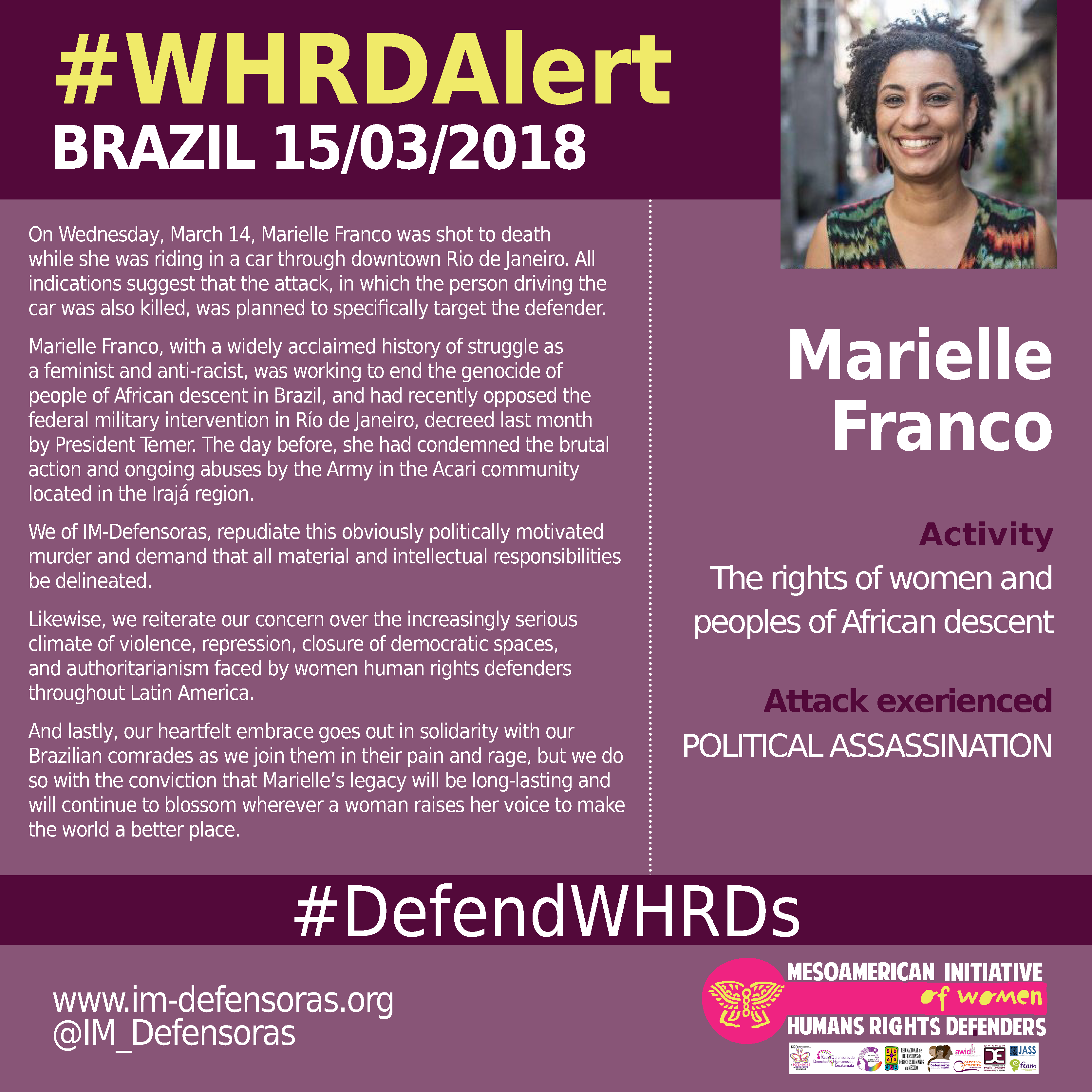 THE FACTS – On Wednesday, March 14, Marielle Franco was shot to death while she was riding in a car through downtown Rio de Janeiro. All indications suggest that the attack, in which the person driving the car was also killed, was planned to specifically target the defender.