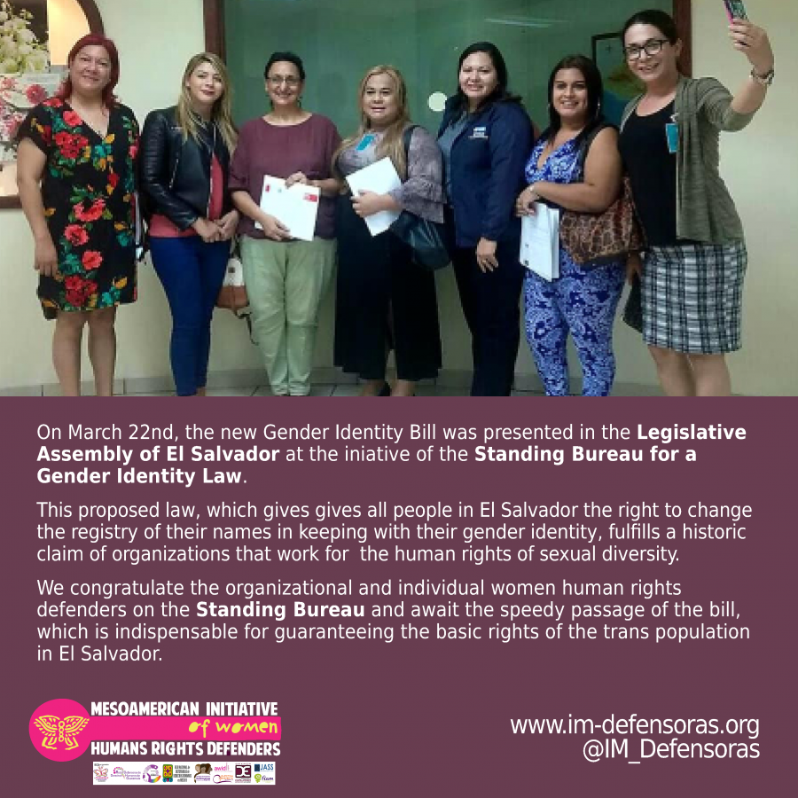 We congratulate the organizational and individual women human rights defenders on the Standing Bureau and await the speedy passage of the bill, which is indispensable for guaranteeing the basic rights of the trans population in El Salvador.