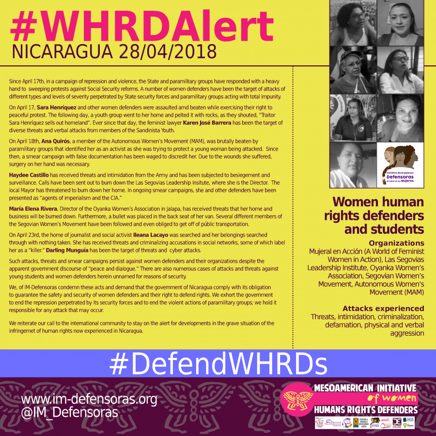 We, of IM-Defensoras condemn these acts and demand that the government of Nicaragua comply with its obligation to guarantee the safety and security of women defenders and their right to defend rights. We exhort the government to end the repression perpetrated by its security forces and to end the violent actions of paramilitary groups; we hold it responsible for any attack that may occur.