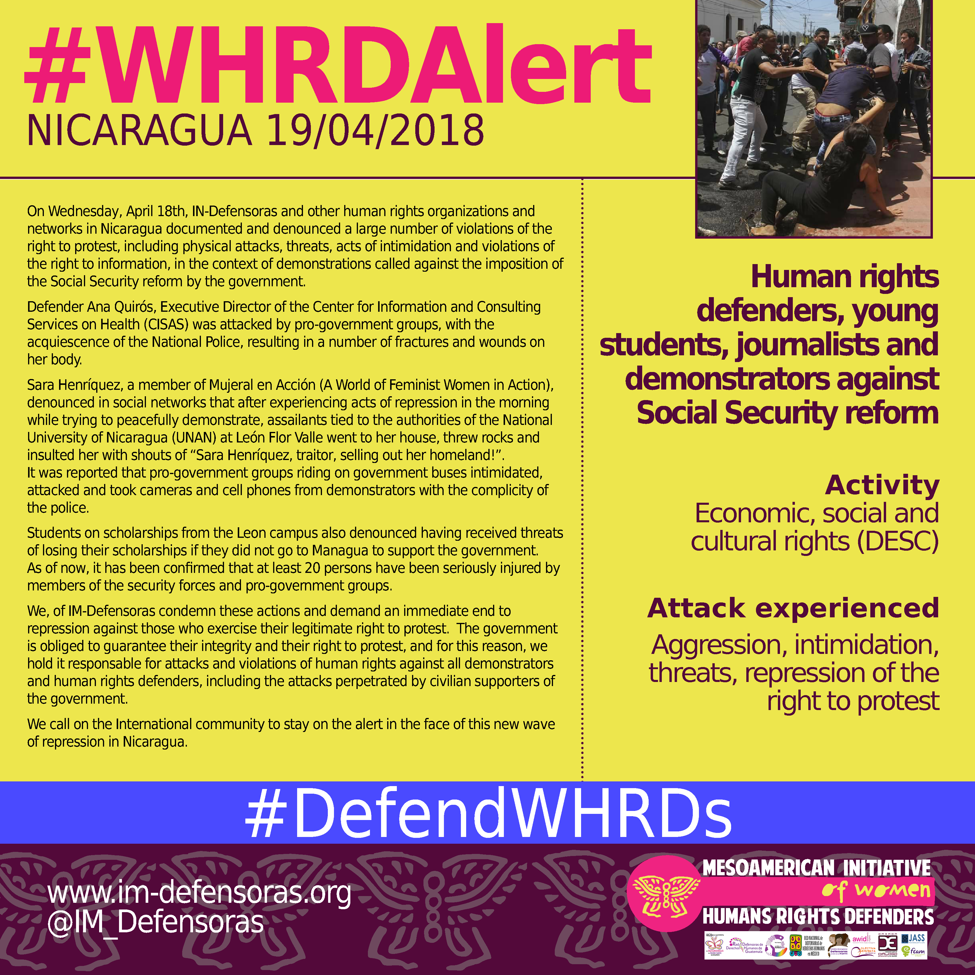 THE FACTS – On Wednesday, April 18th, IN-Defensoras and other human rights organizations and networks in Nicaragua documented and denounced a large number of violations of the right to protest, including physical attacks, threats, acts of intimidation and violations of the right to information, in the context of demonstrations called against the imposition of the Social Security reform by the government.
