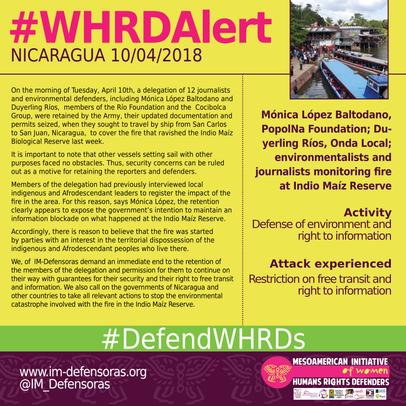 We, of IM-Defensoras demand an immediate end to the retention of the members of the delegation and permission for them to continue on their way with guarantees for their security and their right to free transit and information. We also call on the governments of Nicaragua and other countries to take all relevant actions to stop the environmental catastrophe involved with the fire in the Indio Maíz Reserve.