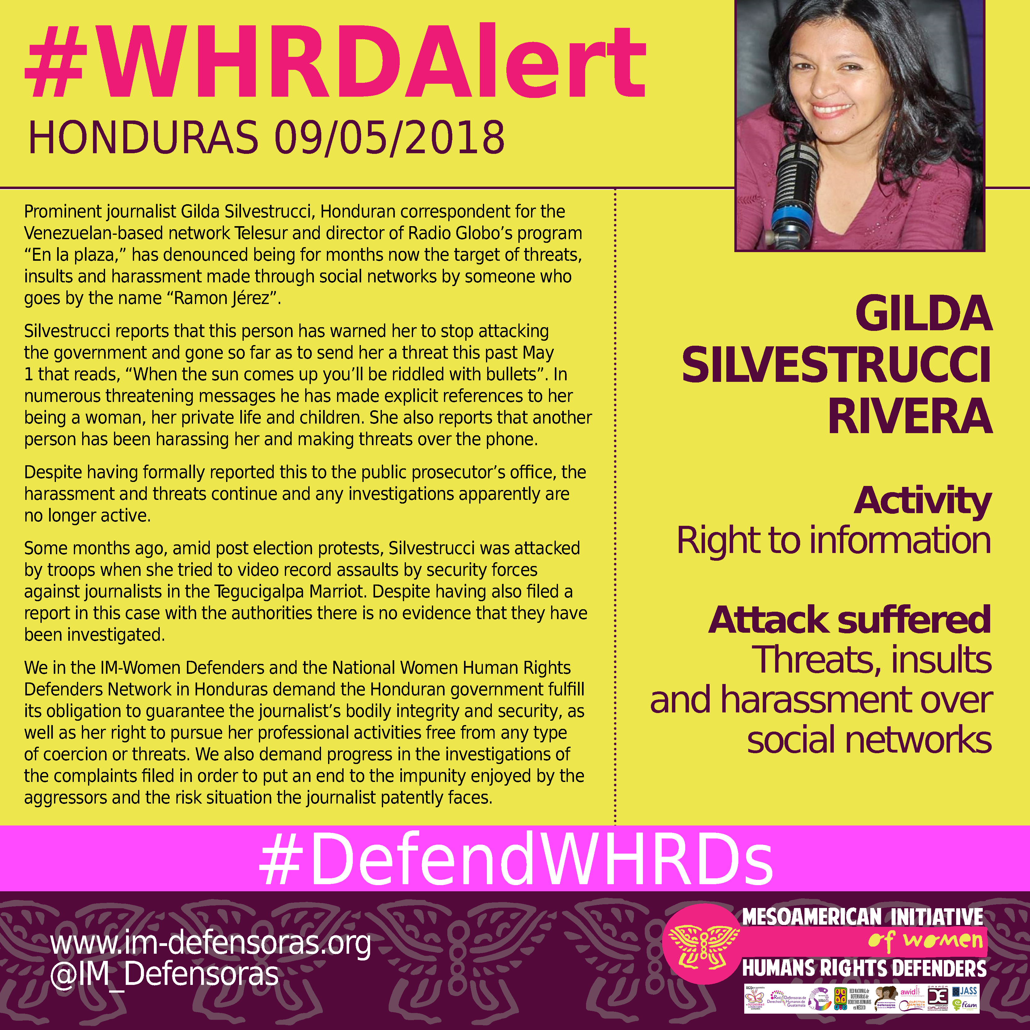 We in the IM-Women Defenders and the National Women Human Rights Defenders Network in Honduras demand the Honduran government fulfill its obligation to guarantee the journalist’s bodily integrity and security, as well as her right to pursue her professional activities free from any type of coercion or threats. We also demand progress in the investigations of the complaints filed in order to put an end to the impunity enjoyed by the aggressors and the risk situation the journalist patently faces.