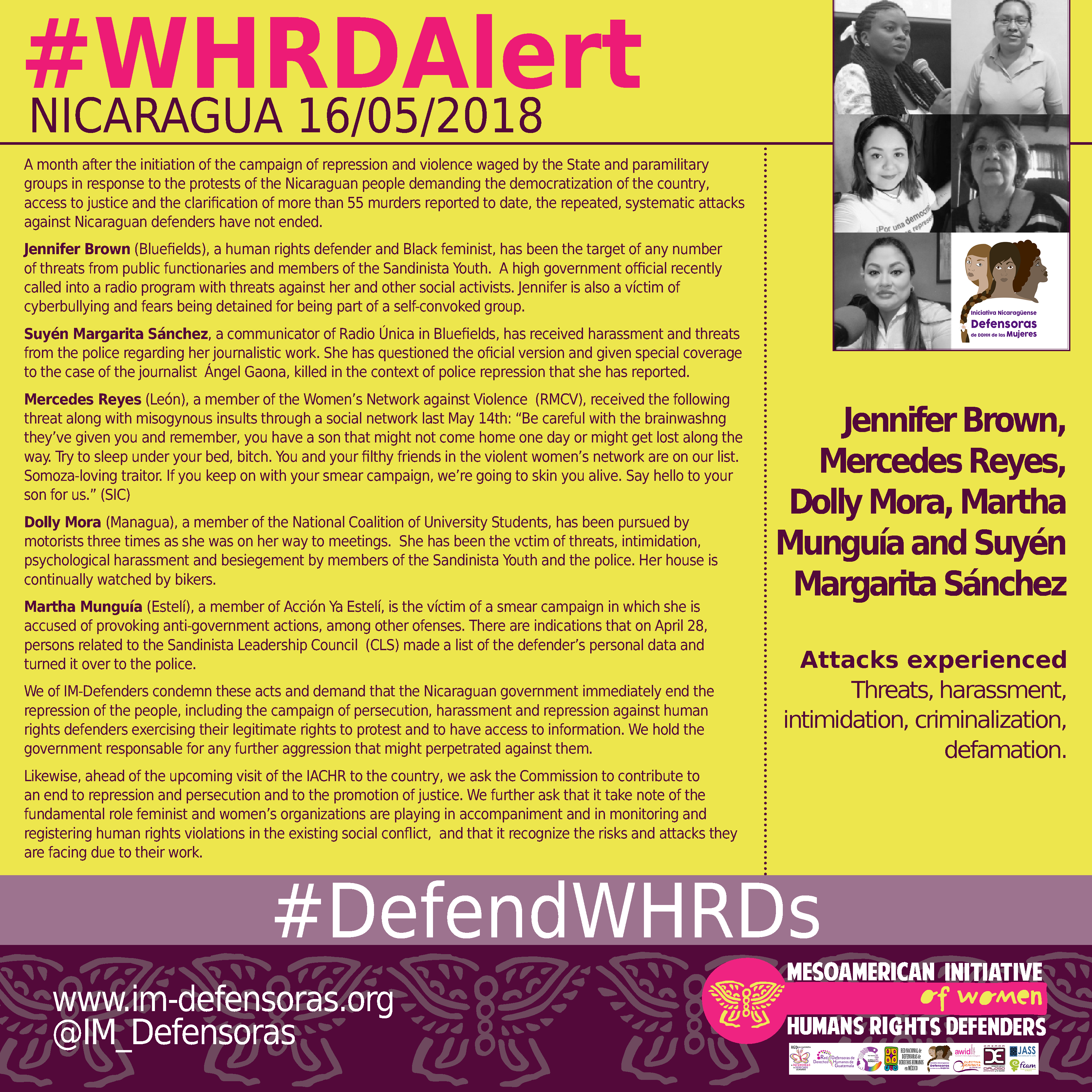 We of IM-Defenders condemn these acts and demand that the Nicaraguan government immediately end the repression of the people, including the campaign of persecution, harassment and repression against human rights defenders exercising their legitimate rights to protest and to have access to information. We hold the government responsable for any further aggression that might perpetrated against them.