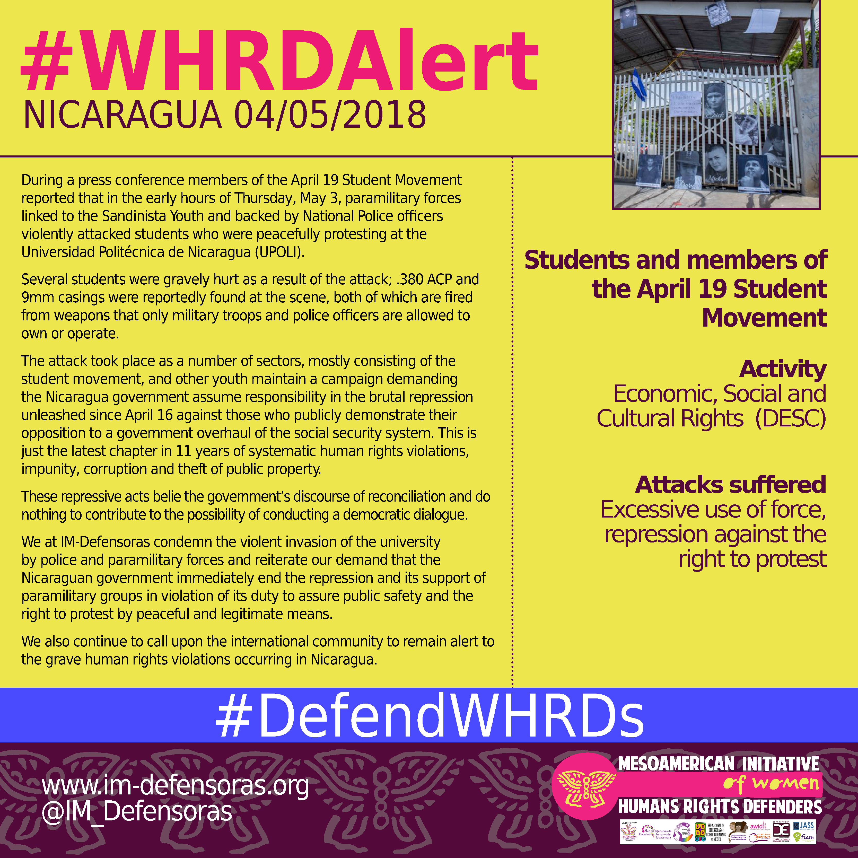 We at IM-Defensoras condemn the violent invasion of the university by police and paramilitary forces and reiterate our demand that the Nicaraguan government immediately end the repression and its support of paramilitary groups in violation of its duty to assure public safety and the right to protest by peaceful and legitimate means.