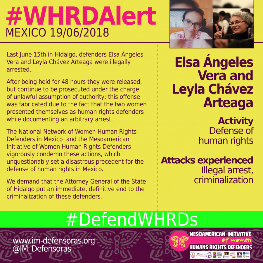 THE FACTS – Last June 15th in Hidalgo, defenders Elsa Ángeles Vera and Leyla Chávez Arteaga were illegally arrested.