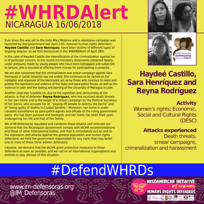 We of IM-Defensoras repudiate and condemn these attacks and reiterate our demand that the Nicaraguan government comply with IACHR recommendations and those of other international bodies, and that it immediately put an end to the repression and attacks against the general population and human rights defenders; we hold the government responsable for any harm that may befall one or more of these three women defenders.