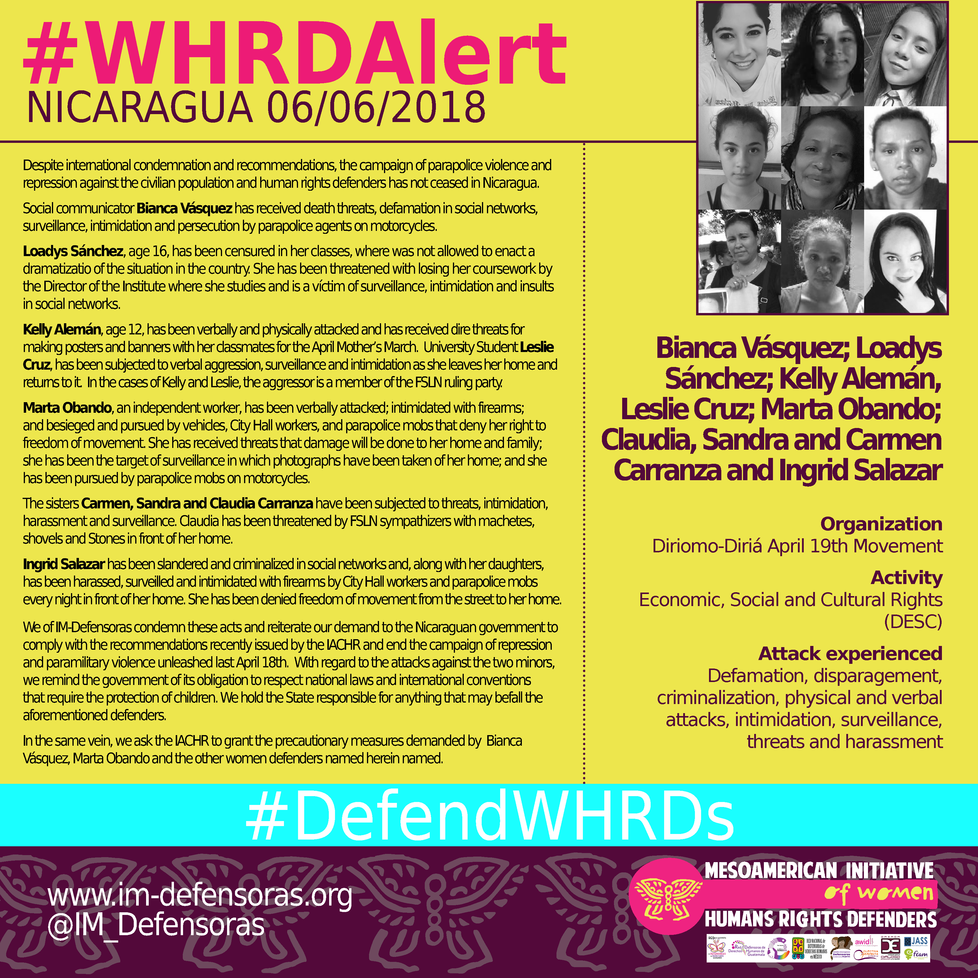 We of IM-Defensoras condemn these acts and reiterate our demand to the Nicaraguan government to comply with the recommendations recently issued by the IACHR and end the campaign of repression and paramilitary violence unleashed last April 18th. With regard to the attacks against the two minors, we remind the government of its obligation to respect national laws and international conventions that require the protection of children. We hold the State responsible for anything that may befall the aforementioned defenders.
