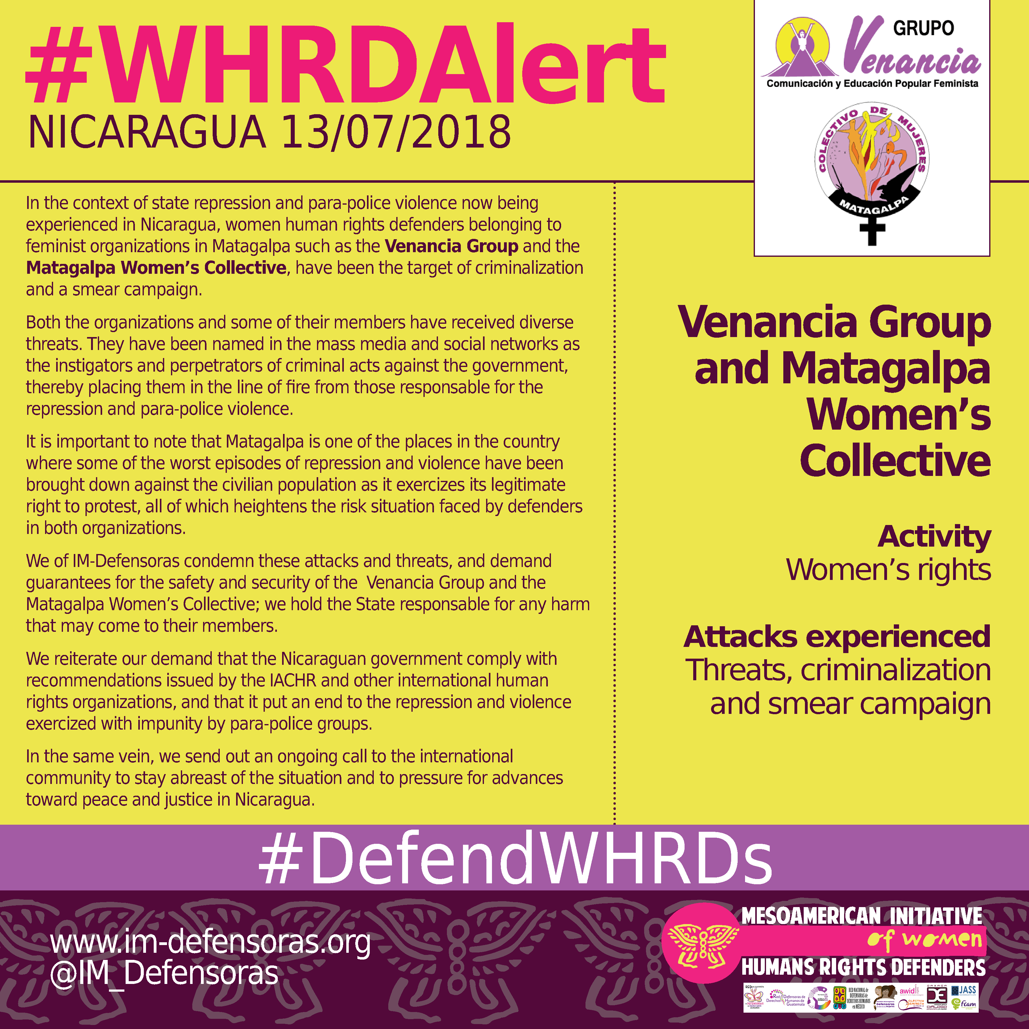 We of IM-Defensoras condemn these attacks and threats, and demand guarantees for the safety and security of the Venancia Group and the Matagalpa Women’s Collective; we hold the State responsable for any harm that may come to their members.