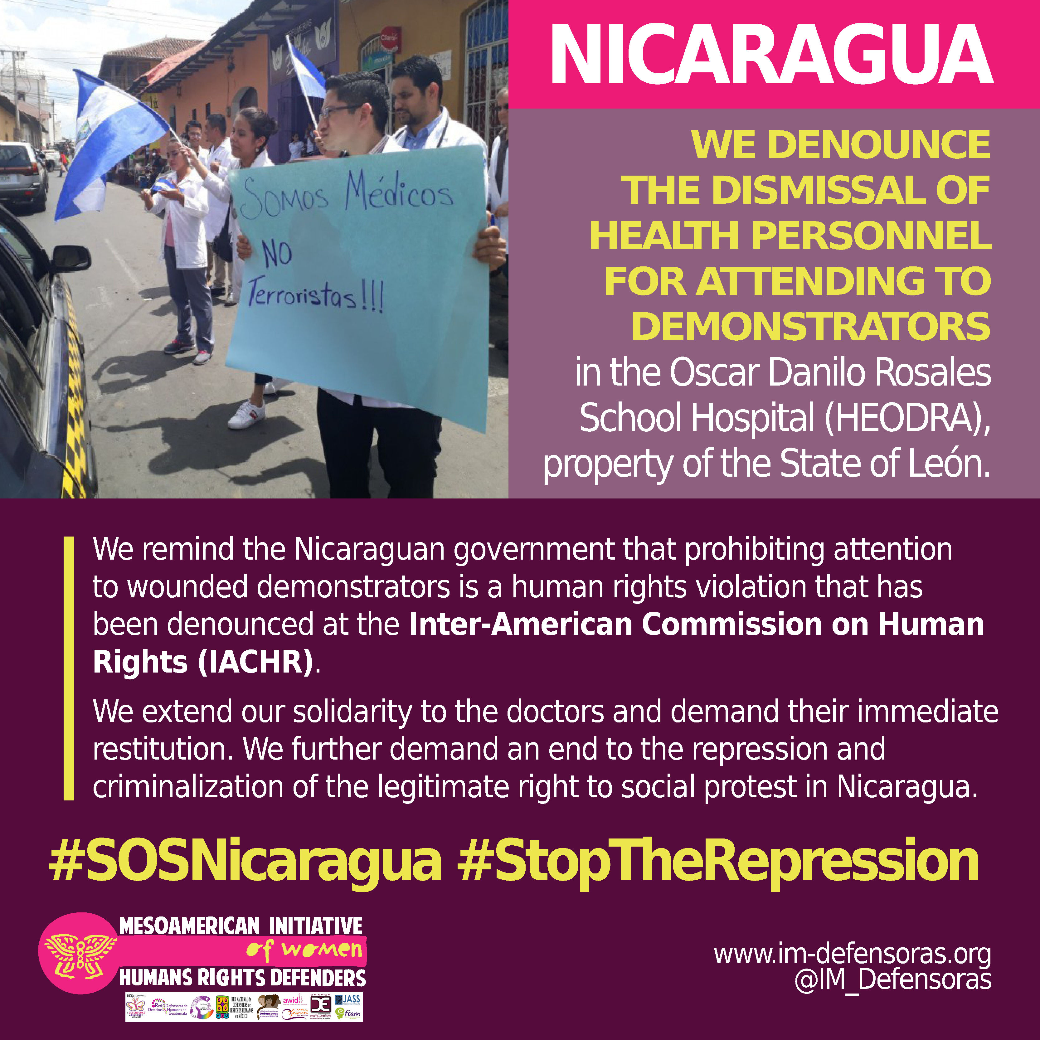 We extend our solidarity to the doctors and demand their immediate restitution. We further demand an end to the repression and criminalization of the legitimate right to social protest in Nicaragua.