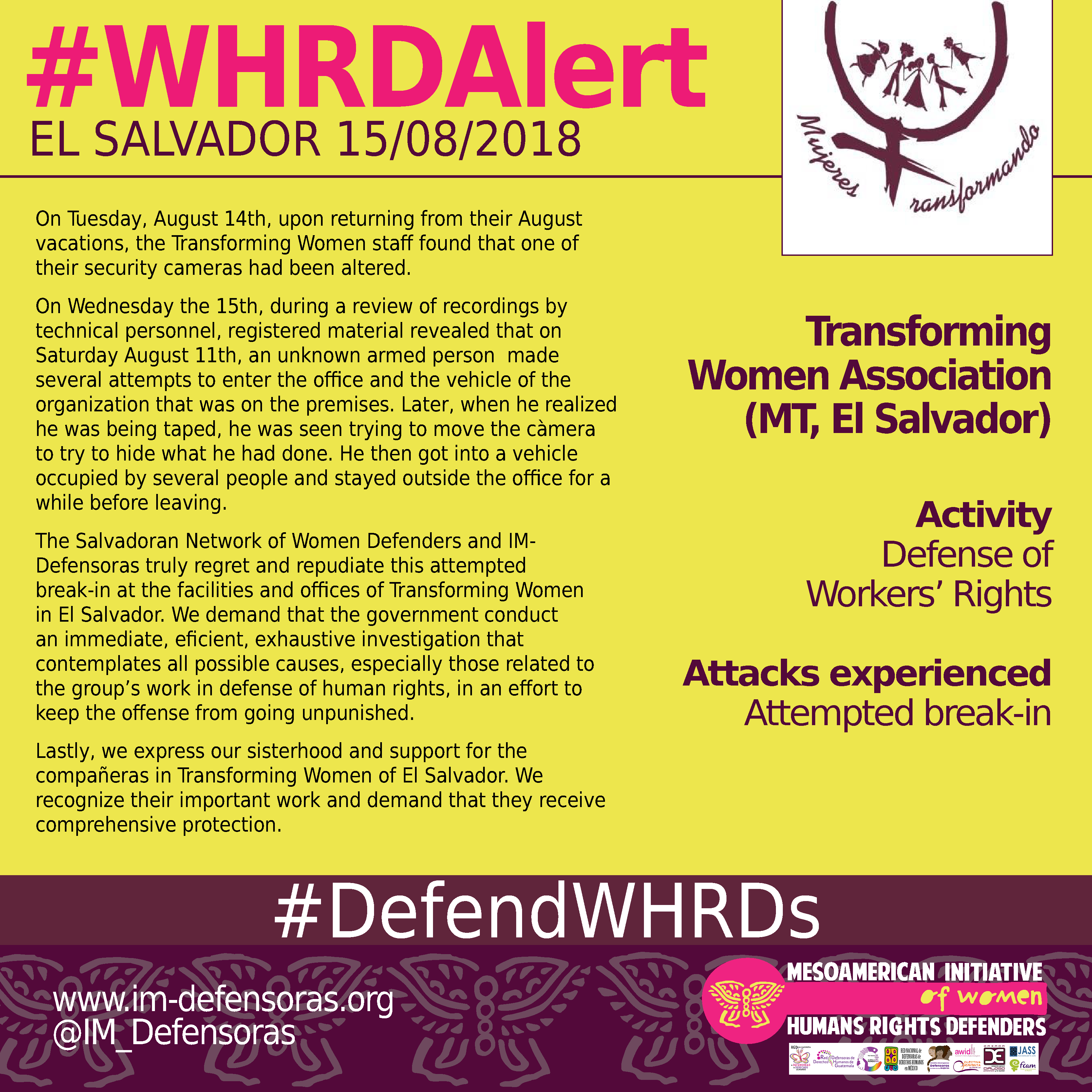 The Salvadoran Network of Women Defenders and IM-Defensoras truly regret and repudiate this attempted break-in at the facilities and offices of Transforming Women in El Salvador. We demand that the government conduct an immediate, eficient, exhaustive investigation that contemplates all possible causes, especially those related to the group’s work in defense of human rights, in an effort to keep the offense from going unpunished.