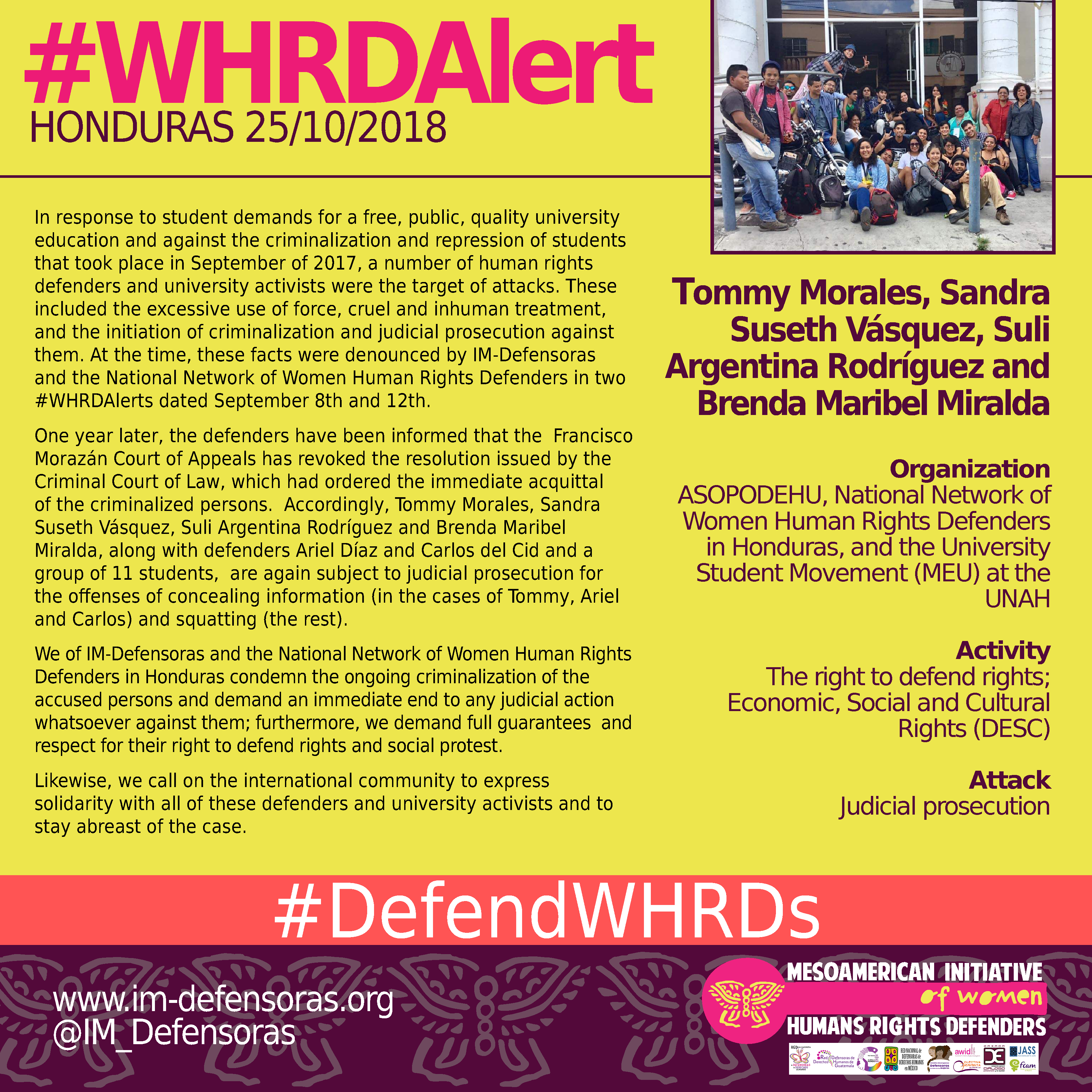 ASOPODEHU, National Network of Women Human Rights Defenders in Honduras, and the University Student Movement (MEU) at the UNAH