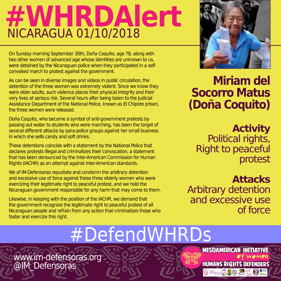 We of IM-Defensoras repudiate and condemn the arbitrary detention and excessive use of force against these three elderly women who were exercizing their legitimate right to peaceful protest, and we hold the Nicaraguan government responsible for any harm that may come to them.