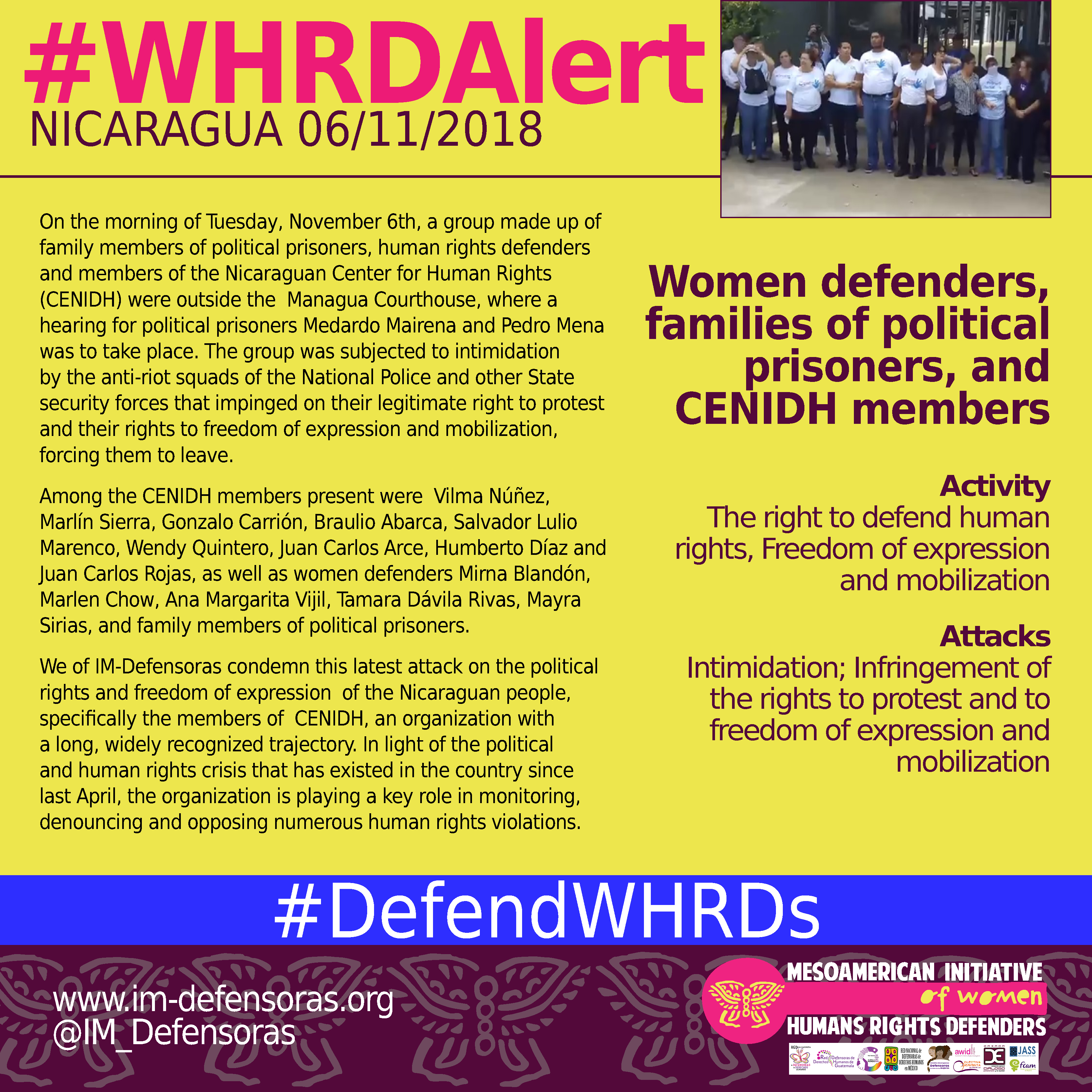 We of IM-Defensoras condemn this latest attack on the political rights and freedom of expression of the Nicaraguan people, specifically the members of CENIDH, an organization with a long, widely recognized trajectory. In light of the political and human rights crisis that has existed in the country since last April, the organization is playing a key role in monitoring, denouncing and opposing numerous human rights violations.