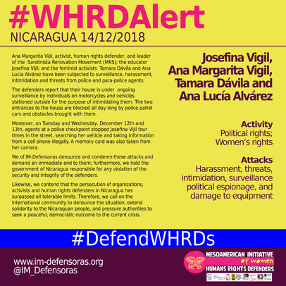 THE FACTS – Ana Margarita Vijil, activist, human rights defender, and leader of the Sandinista Renovation Movement (MRS); the educator Josefina Vijil; and the feminist activists Tamara Dávila and Ana Lucía Alvárez have been subjected to surveillance, harassment, intimidation and threats from police and para-police agents.