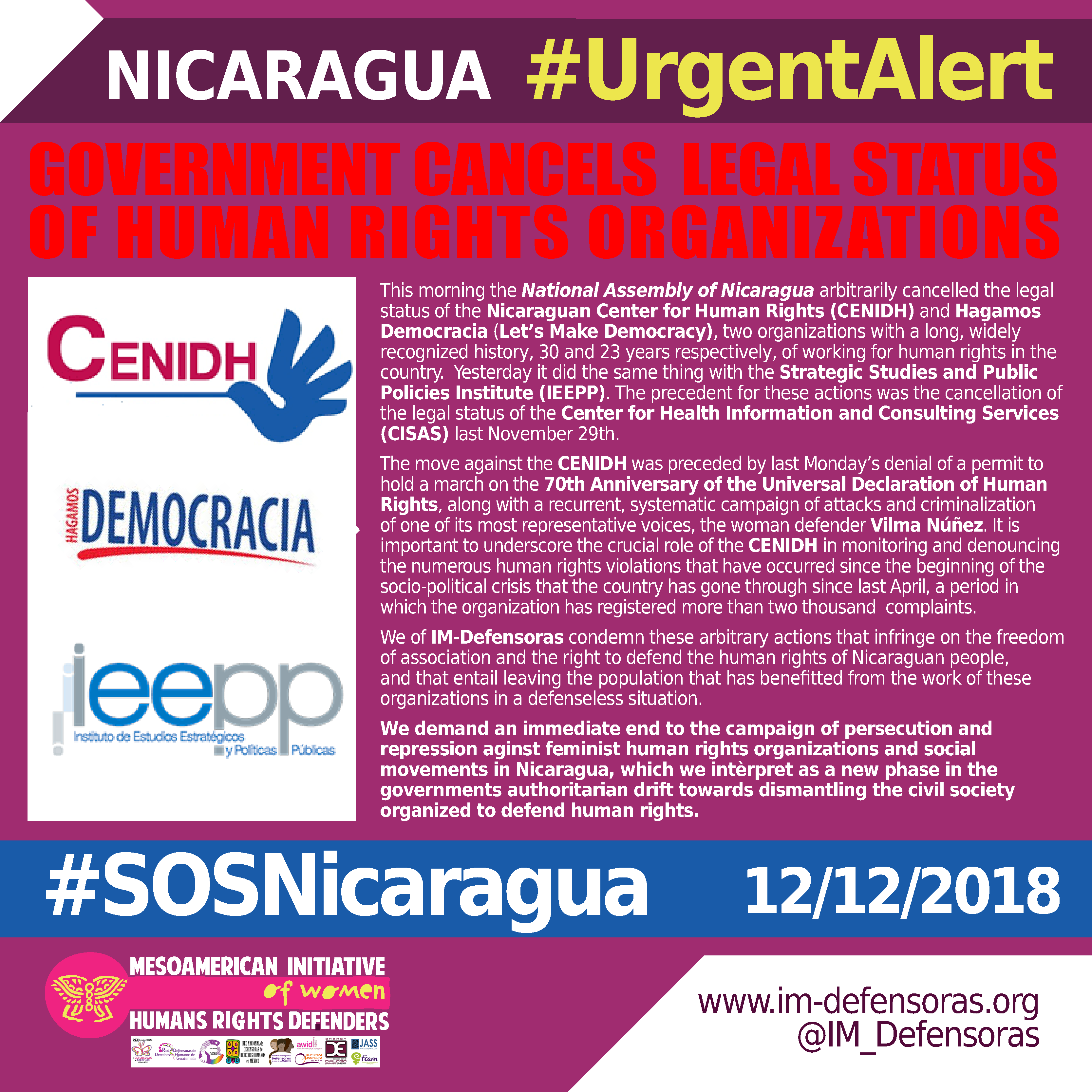 We of IM-Defensoras condemn these arbitrary actions that infringe on the freedom of association and the right to defend the human rights of Nicaraguan people, and that entail leaving the population that has benefitted from the work of these organizations in a defenseless situation.