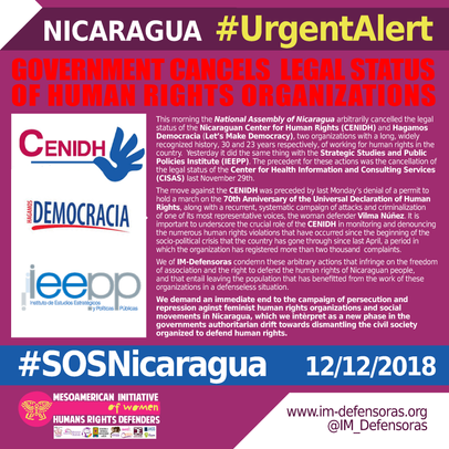 The move against the CENIDH was preceded by last Monday’s denial of a permit to hold a march on the 70th Anniversary of the Universal Declaration of Human Rights, along with a recurrent, systematic campaign of attacks and criminalization of one of its most representative voices, the woman defender Vilma Núñez. It is important to underscore the crucial role of the CENIDH in monitoring and denouncing the numerous human rights violations that have occurred since the beginning of the socio-political crisis that the country has gone through since last April, a period in which the organization has registered more than two thousand complaints.