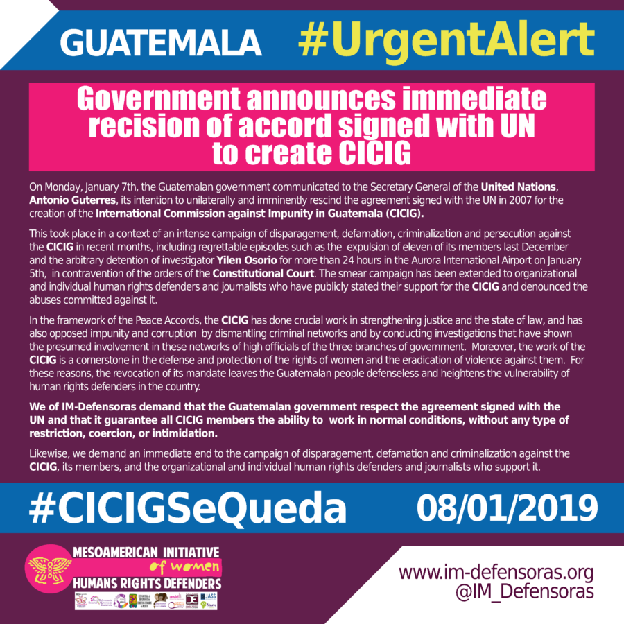 We of IM-Defensoras demand that the Guatemalan government respect the agreement signed with the UN and that it guarantee all CICIG members the ability to work in normal conditions, without any type of restriction, coercion, or intimidation.