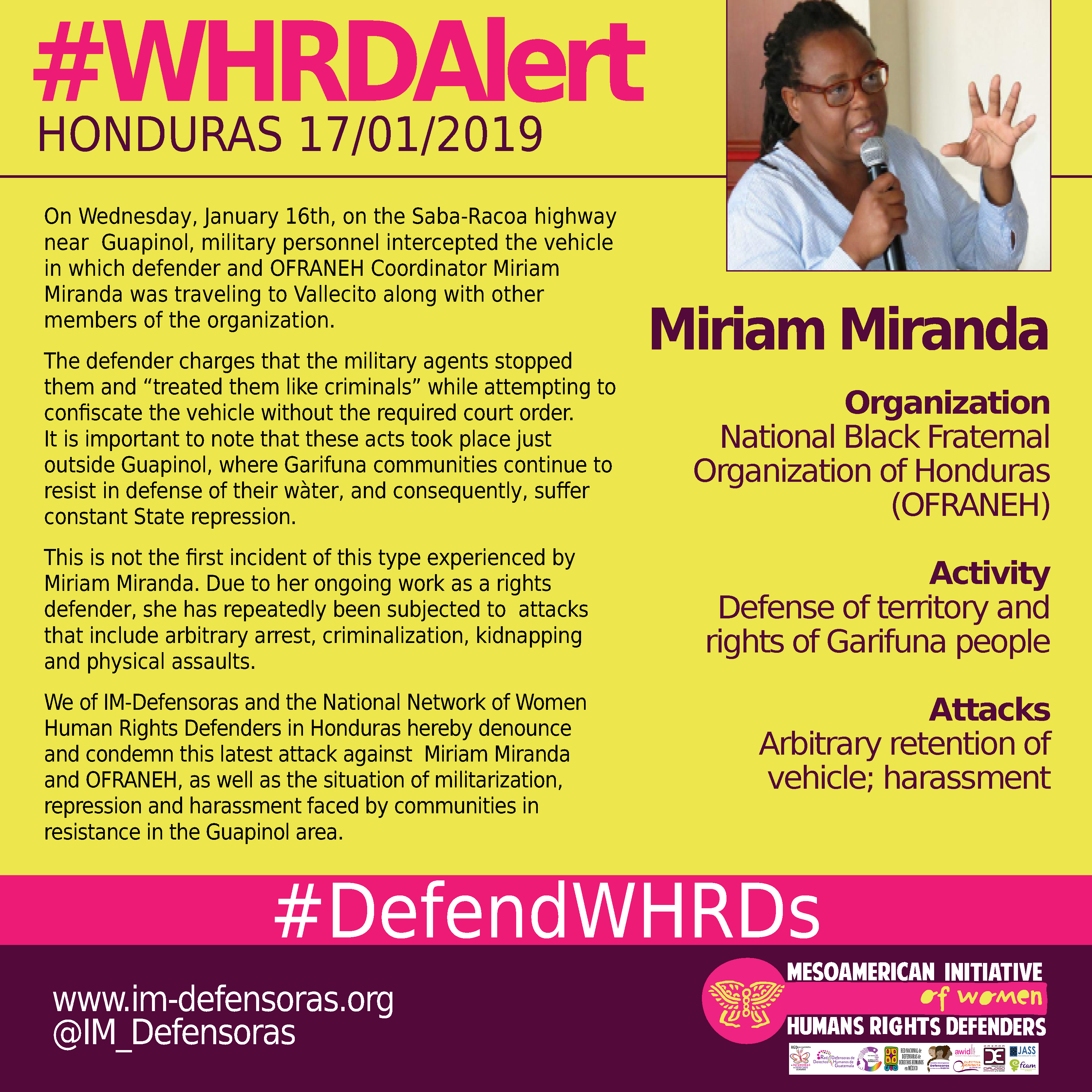 We of IM-Defensoras and the National Network of Women Human Rights Defenders in Honduras hereby denounce and condemn this latest attack against Miriam Miranda and OFRANEH, as well as the situation of militarization, repression and harassment faced by communities in resistance in the Guapinol area.